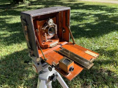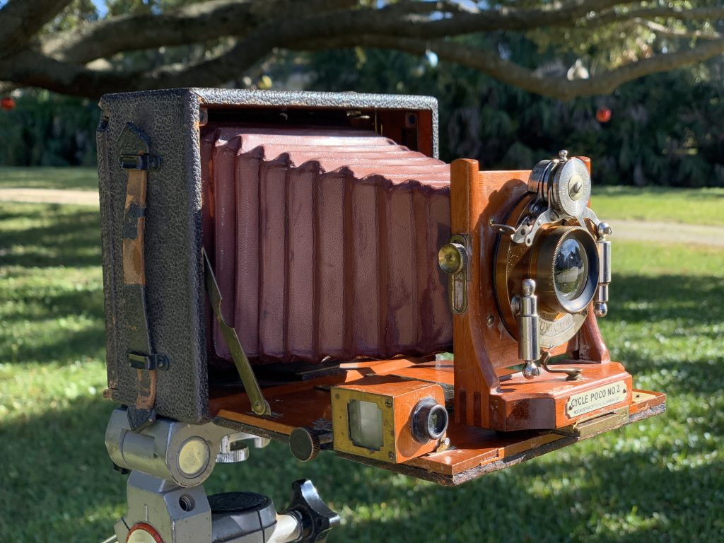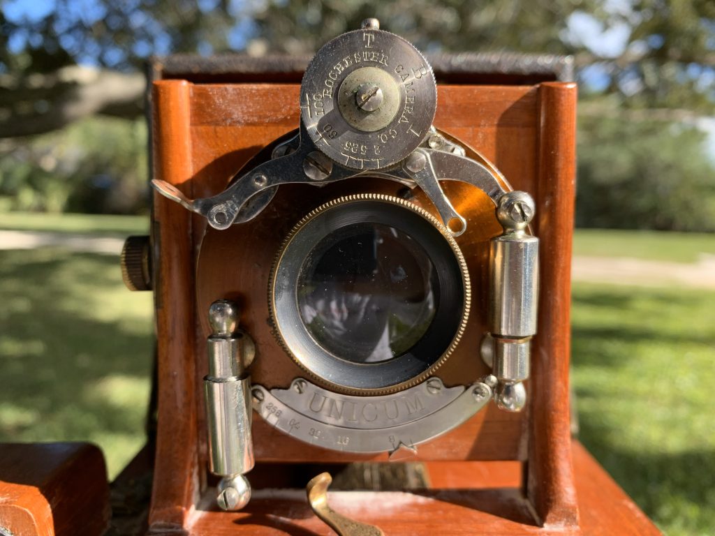 The camera is a folding Rochester Cycle Poco No. 2 model from 1896.