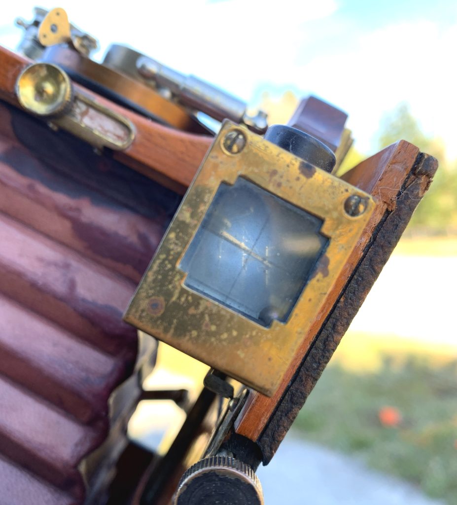 This view finder uses a mirror or prism to optically project the scene, although upside-down, so you can frame it up properly. You don’t actually put your eyeball up to it like modern viewfinders. The image is projected pretty clearly onto a glass plate. I really don’t fully understand it. It’s amazing though.