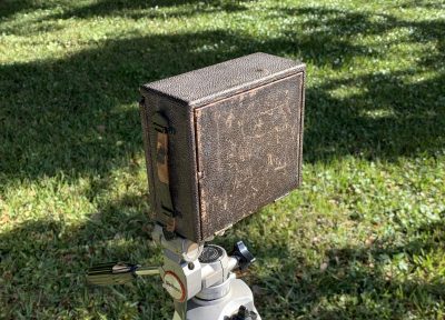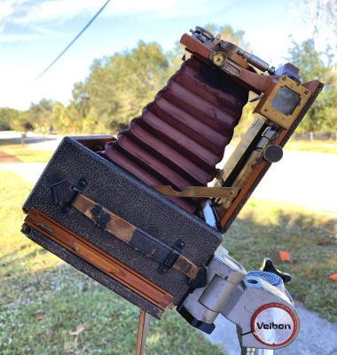 It’s a beautiful little portable foldable camera. It’s mostly made out of wood except for the actual iris/lens/trigger part. It folds up into a pretty small box that measures 6 inches by 6 inches by 3 inches.
