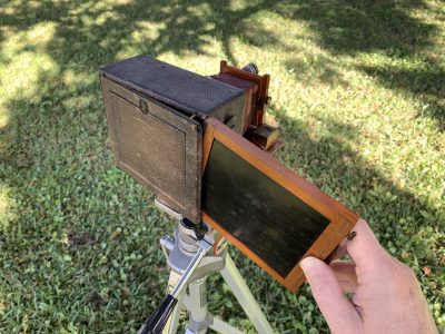 If you place a piece of thin tissue paper into the same plane that holds the glass dryplate, you will be able to clearly see the image being projected by the camera lens onto the other side of the tissue paper. It’s like a little movie projector on the back of the camera!