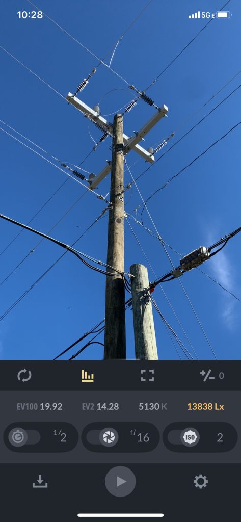I decided to take my first photo of a power pole near my house. I thought this scene would give me some good contrast between the wooden pole and the bright sky. Plus nothing would be moving in this scene. Other than my camera a bit maybe during my long exposure triggering. Also, this is a very repeatable scene if I really screwed it up and had to do it over again later.