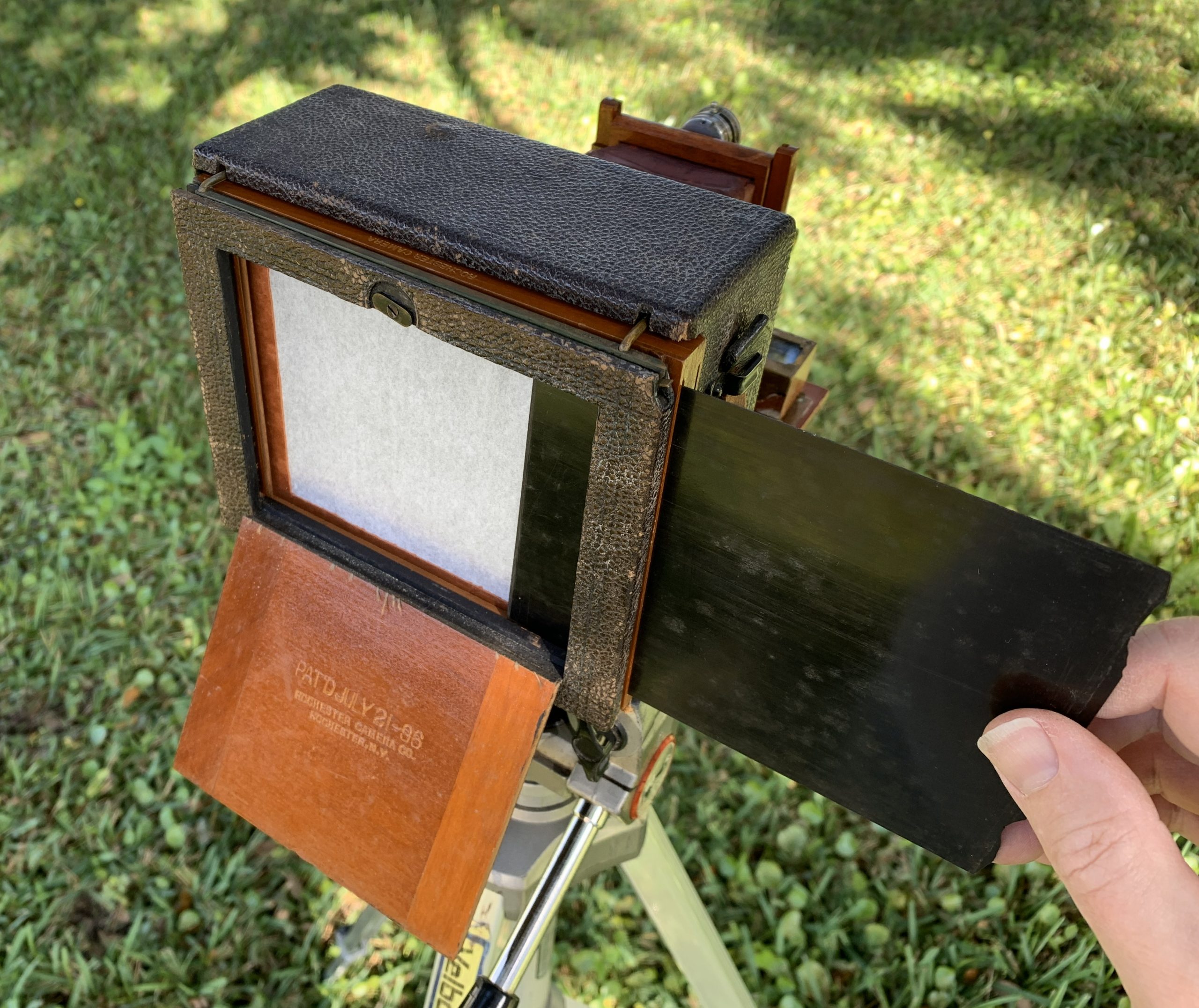 This camera doesn’t actually take film though. It exposes light to a 4 inch by 5 inch glass plate, known as a dryplate , that’s been coated with a thin layer of light sensitive silver gelatin . Flexible plastic photographic film was invented in the late 1880s, but was not super popular when this camera was sold. Most cameras of this era used glass dryplates.