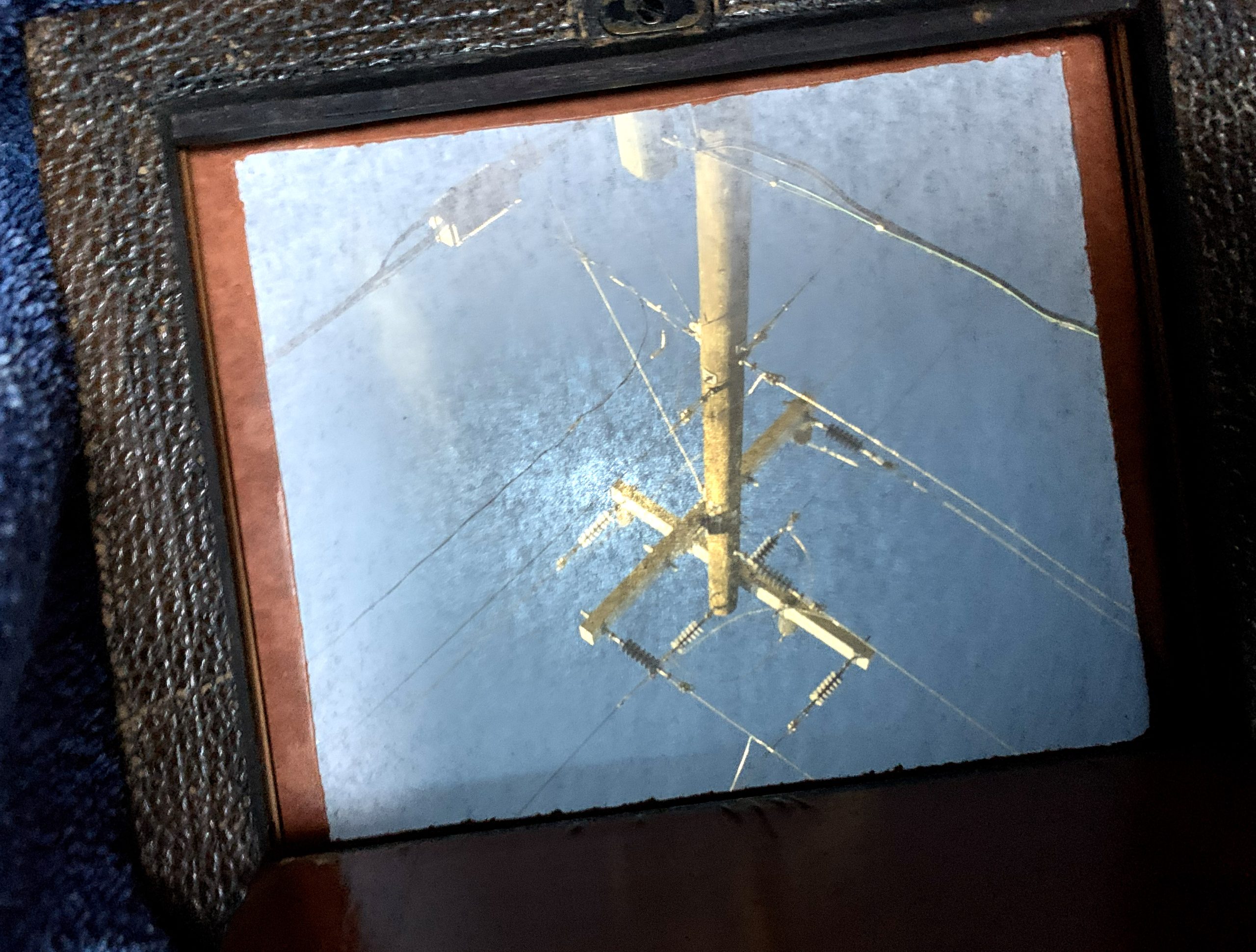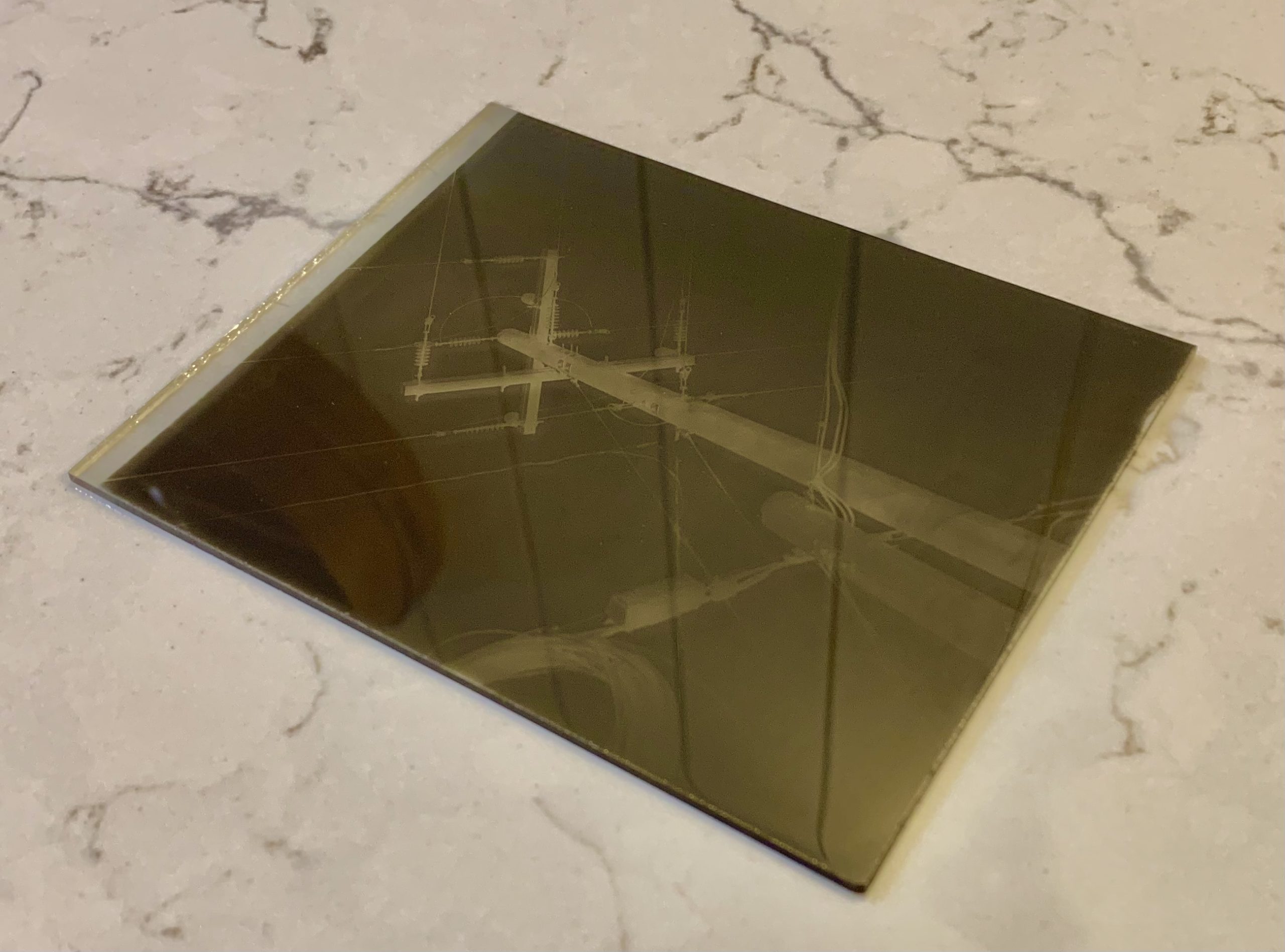 Once developed, fixed, and dried overnight, the glass dryplate showed a pretty nice negative image of the scene, like so: