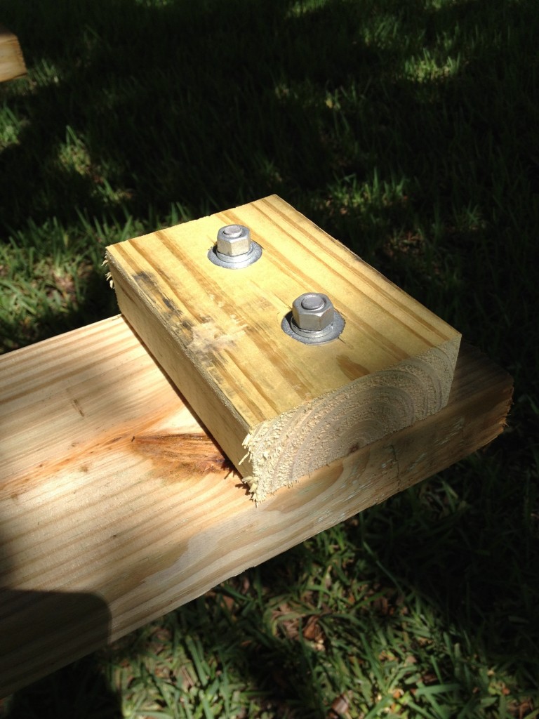 Here is a close up of one of the spacers before it was permanently mounted. A block of 2×6 was pretty much the height I needed.