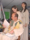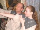 Amy, an adoring fan, poses for a picture with Father Mike after a show.